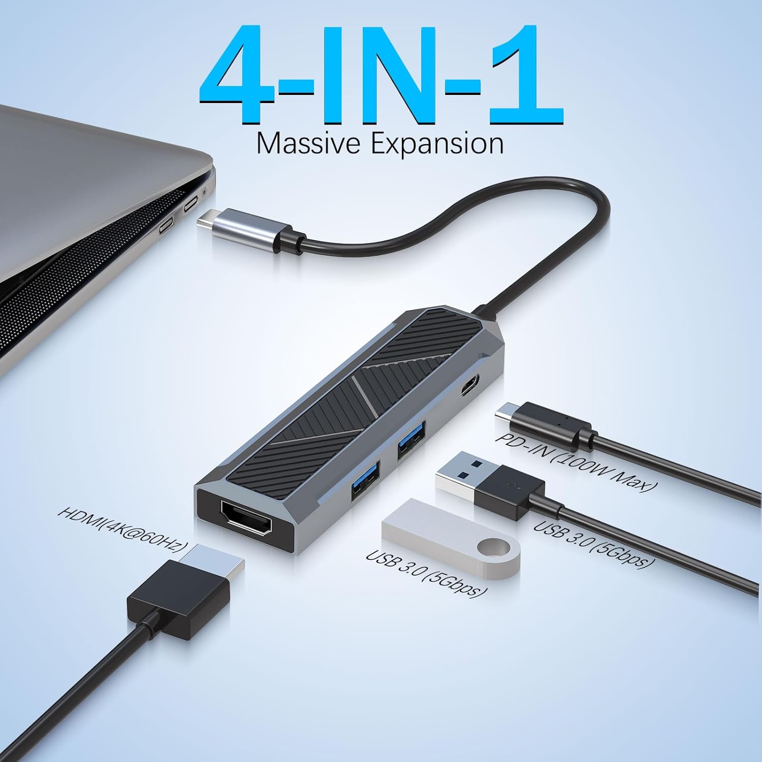 4-in-1 USB-C Hub cum 4K 60Hz HDMI Scissura est fabrica dilatatio multifunctionalis quae cum laptop, tabula aut fabrica per interfaciem USB-C coniungitur. Unum USB-C portum in quattuor optiones connectivity essentiales convertit, incluso HDMI output typice et plures portus notitias USB.