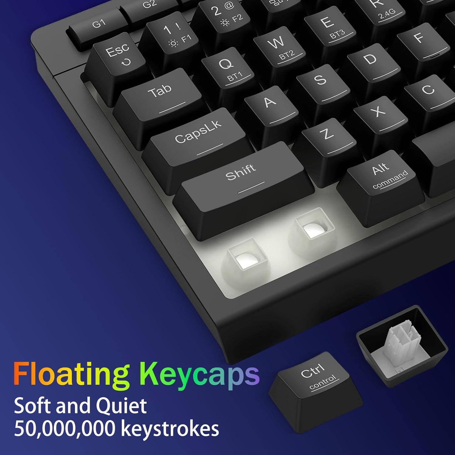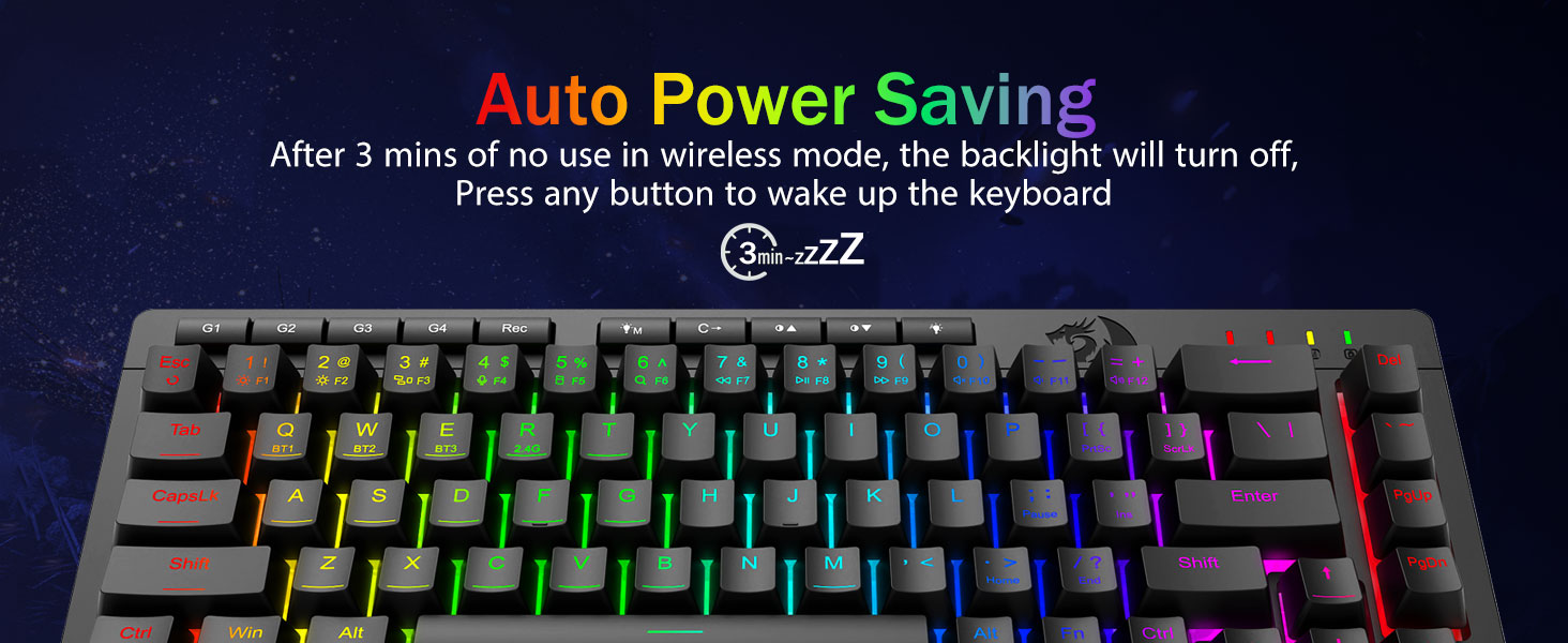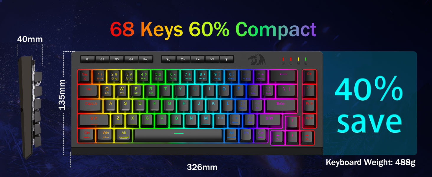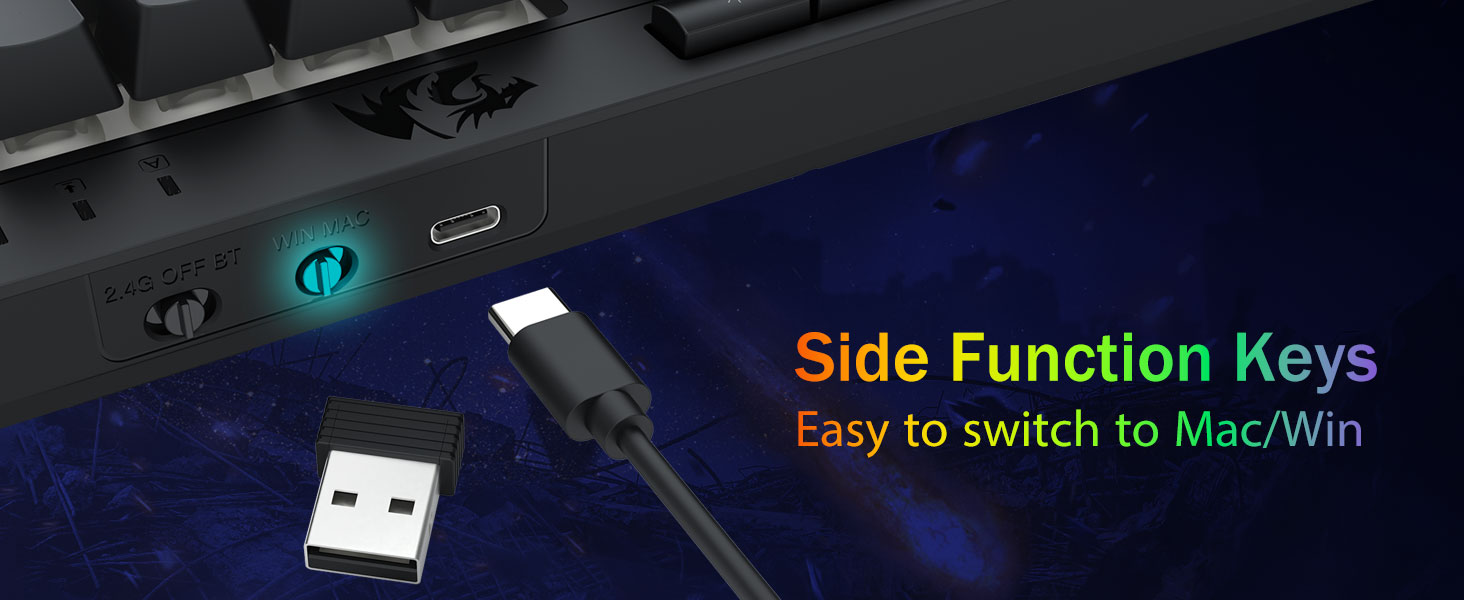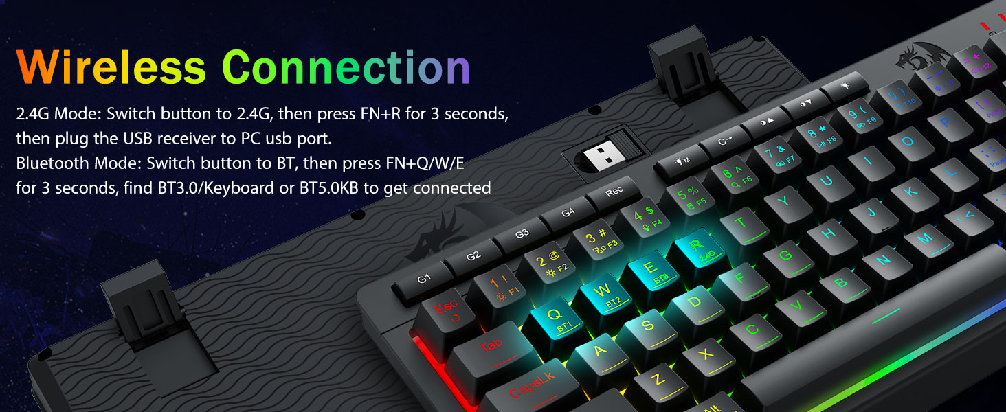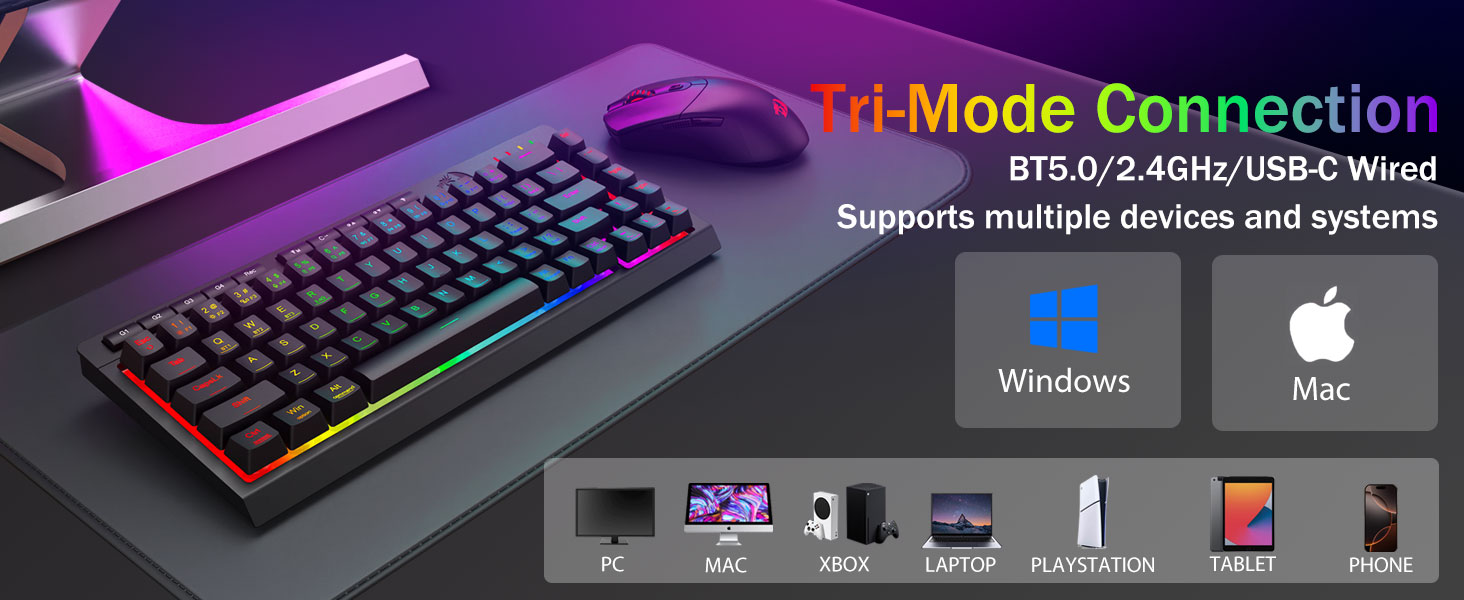 Tri-Modus Versatility & Multi Fabrica Dominatus -Seamlessly flectendum inter Bluetooth 5.0, 2.4GHz wireless, vel USB-C modos filatos, connectens simul ad 5 machinas (PC, Mac, tabulas, phones, PS/XBOX). Sine labore toggle cogitationes per breves claves vel partem conjunctionem-perfectam ad opus hybrid / ludum setups. Manete powered for hebdomades cum pugna 4,000mAh (30+ dierum standby, 50hrs RGB runtime).