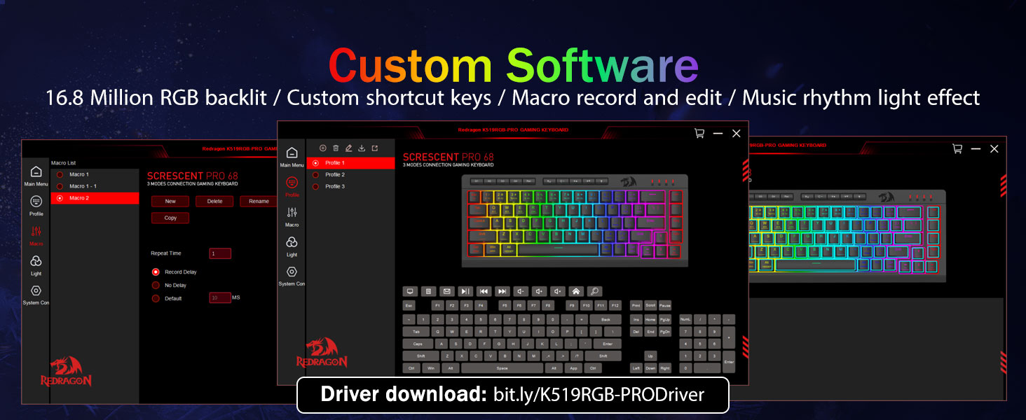 Niger K519 Pro Portable Wireless Gaming Cantiones a Redragon, fabricatum a Chuangquan, exemplificat professionali gradus machinandi pro gamers et professionales similes. Eius consilium versatile tri-modus firmum Bluetooth, humile- latency 2.4GHz wireless sustinet, et nexus filum nexus USB-C, ut sine labore inter tres strophas simul mutandas sustineat. In tincidunt clavium tortor dicatarum includit, quae per programmatum intuitivam plene nativus esse potest, permittens utentes ad mandatum complexum vel breves ad augendam efficientiam ac ludum efficientiam assignandum. Dynamica RGB illuminans cum multiplicibus effectibus personalizat ut habeat, dum N-clavem rollover et anti-sponsans invigilat quodlibet keystroke in intensis sessionibus accurate relatus est.