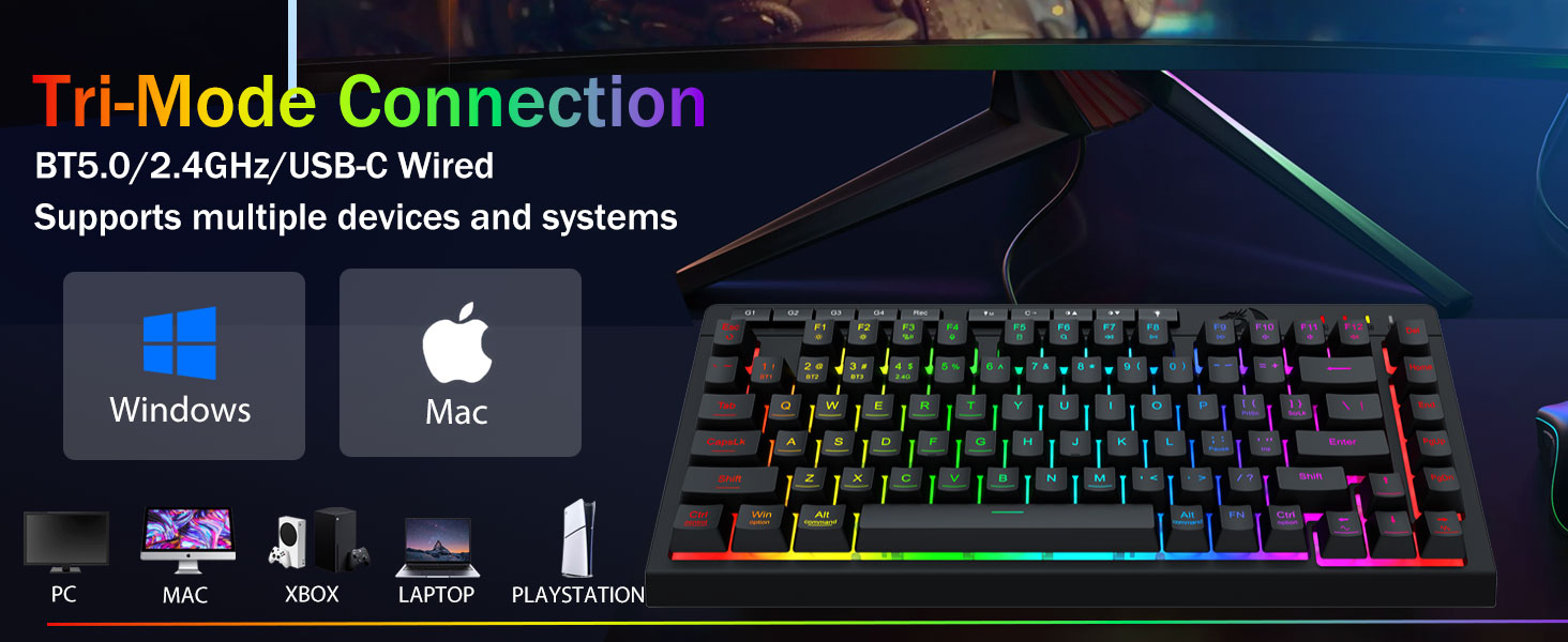 Tri-Modus Versatility & Multi Fabrica Mastery- Commutatione transibit inter Bluetooth 5.0, 2.4GHz wireless, vel USB-C modos filatos, connectens simul ad 5 cogitationes (PC, Mac, tabulas, phones, PS/XBOX).