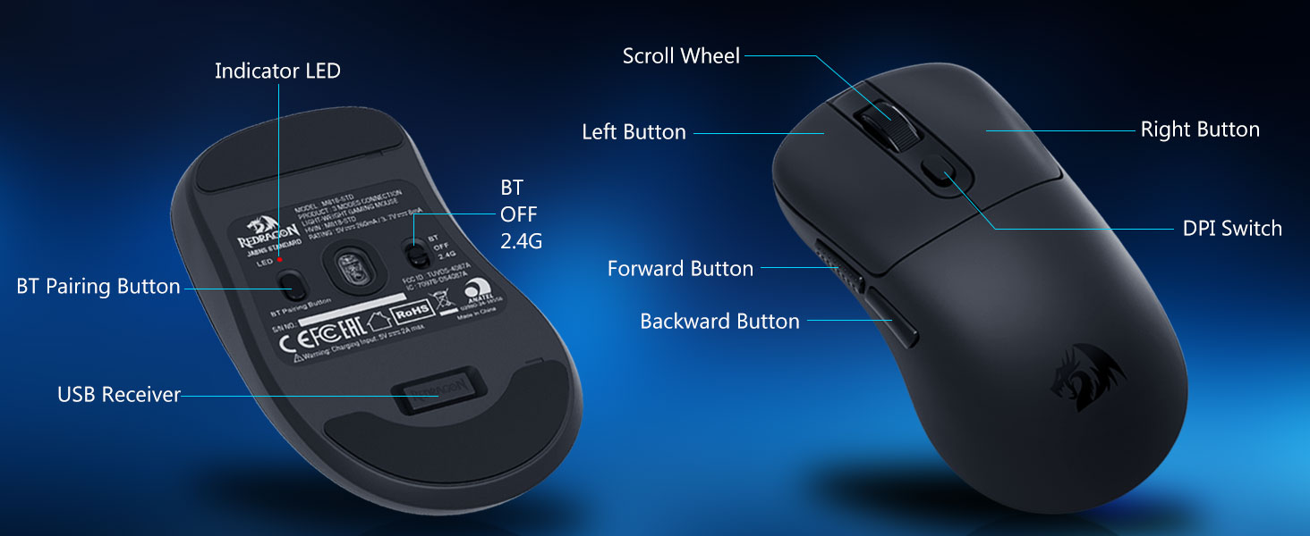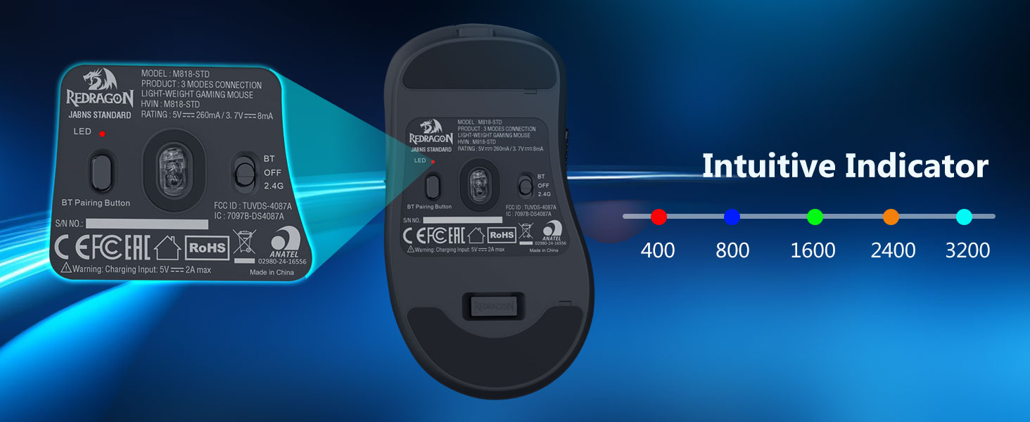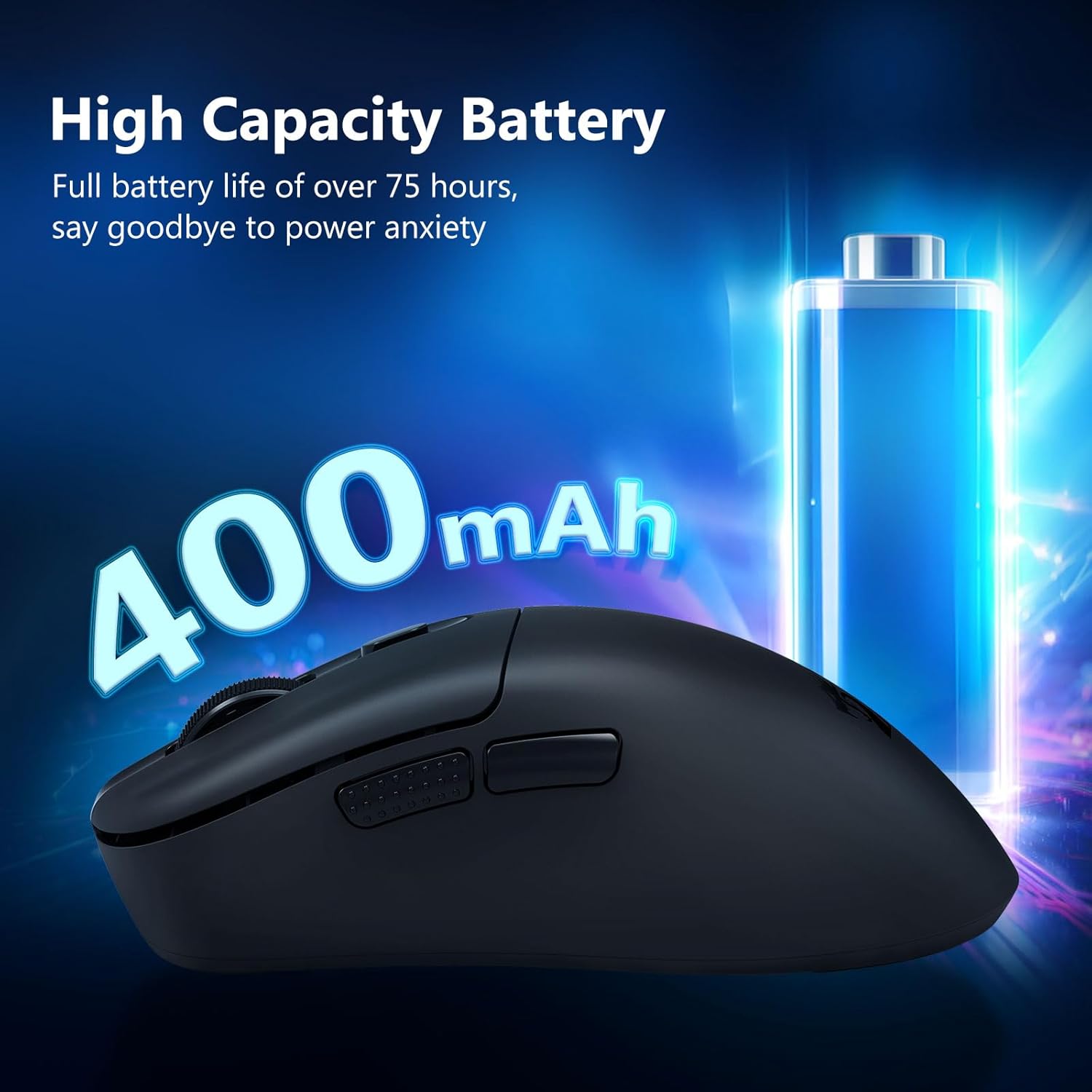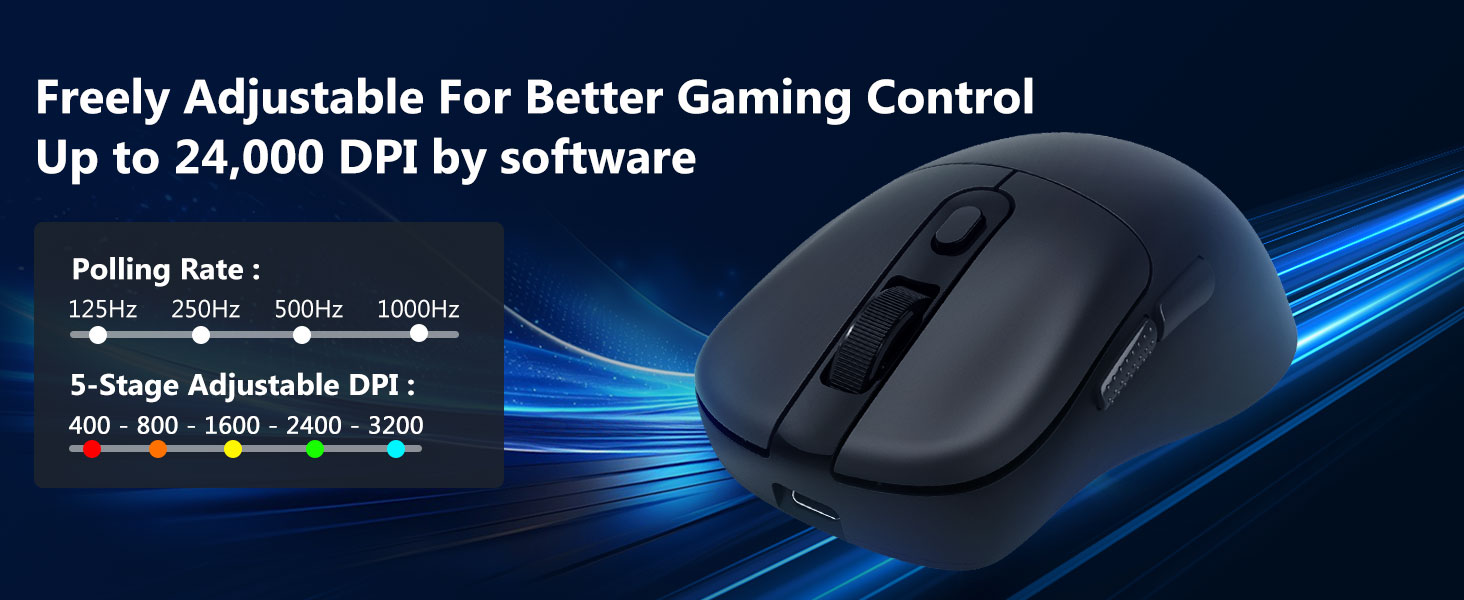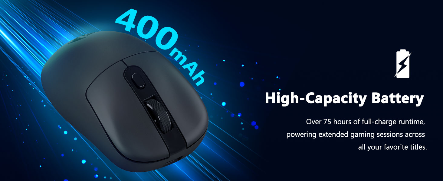 2.4GHz modus wireless stabilis et responsivam inputationem praestat, pigram reducens et in actionibus rapidis gressibus constantem potestatem servans.