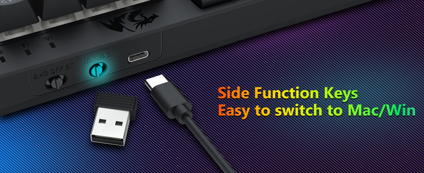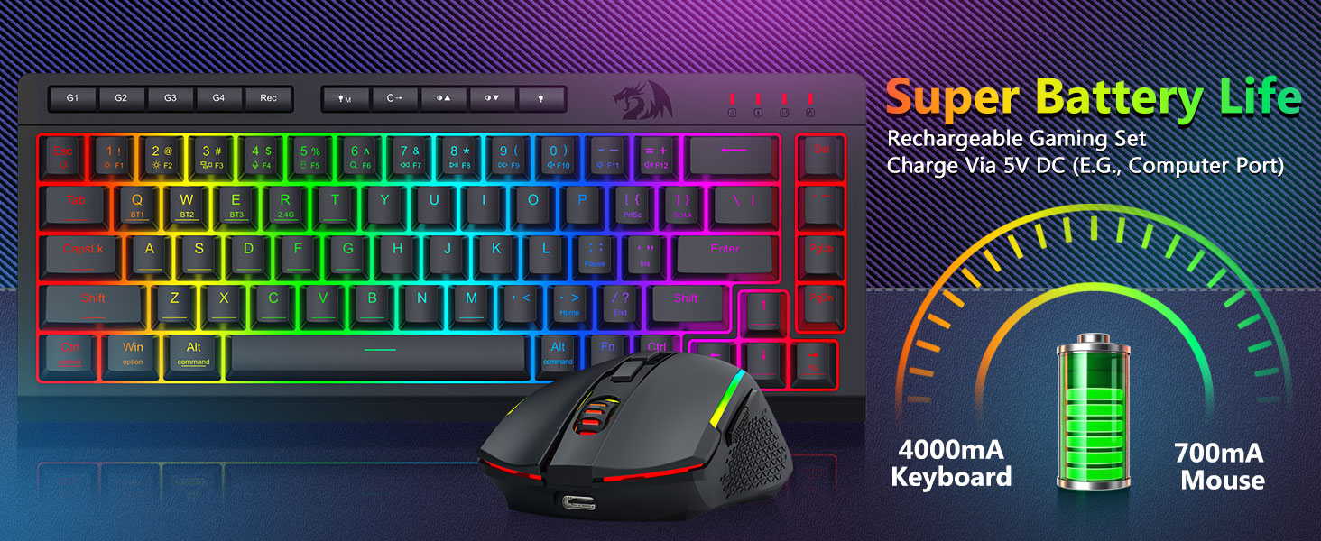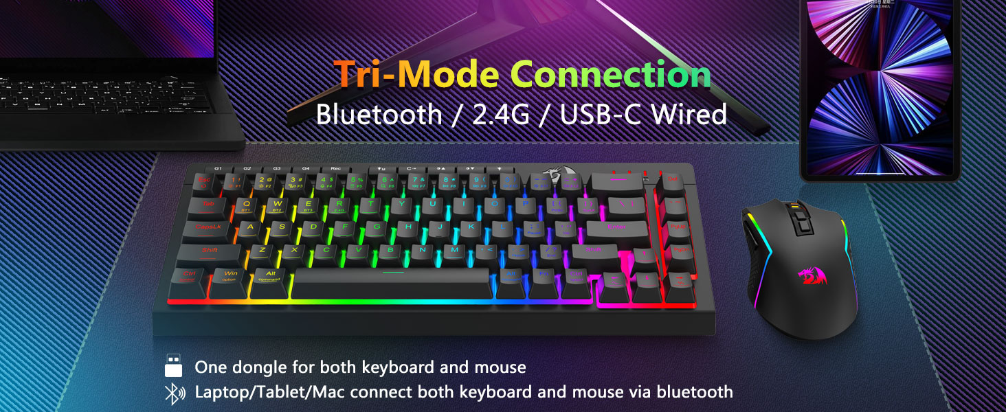 Tri-Modus Versatility Cantiones et Muris- Commutatione transibit inter Bluetooth 5.0, 2.4GHz wireless, vel modos wired USB-C, connectens usque ad varias machinas (PC, Mac, tabulas, phones, PS/XBOX). Sine labore toggle cogitationes per breves claves vel partem conjunctionem-perfectam ad opus hybrid / ludum setups. Manete powered per hebdomades cum 4000mAh altilium claviaturae et 700mAh altilium Muris (30+ dies sto, 50hrs RGB runtime).