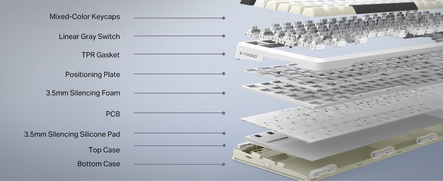 Et sonitus-reductionem systema de gasket-mounted keyboards utilitas multi-strepitus cushioning materiae ad optimize et tactile feedback et acusticus perficientur. Key components includit: laminam spumam (Poron spumam inter laminam et PCB ad eliminare switch vibration sonitus), SWITCH PCB superficiem ad supprimunt Spring Silicone vel spumam (summus density in cavum vel spumam (summus density et in casu sub PCB ad density Silicone vel spumam (summus density et in casu in pcb in psasity et casus in Silicone). Premium Designs Incorporate Poron Gaskets (internus conventus anser) et ptfe acusticus films (conflans summus frequency sonitus).