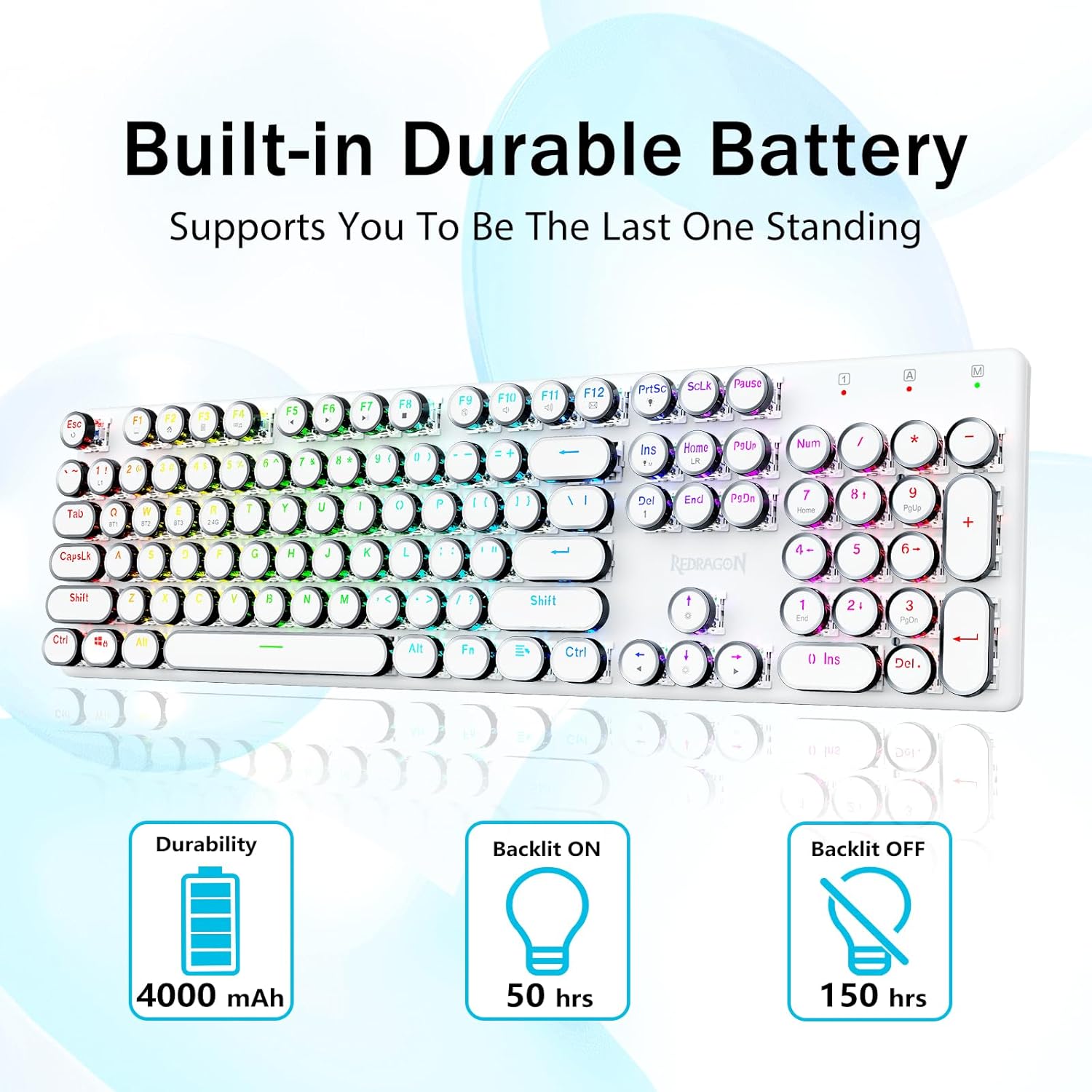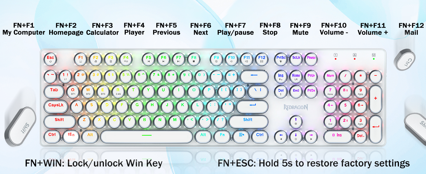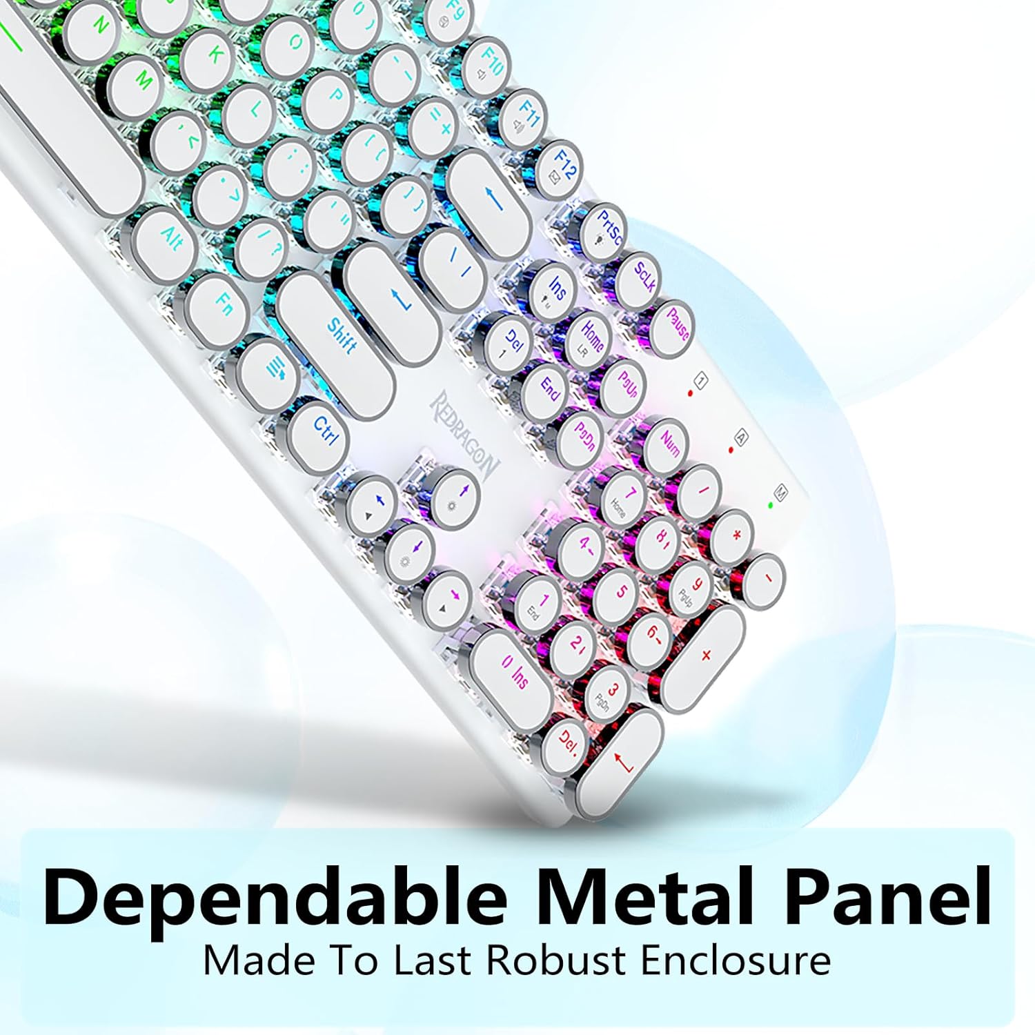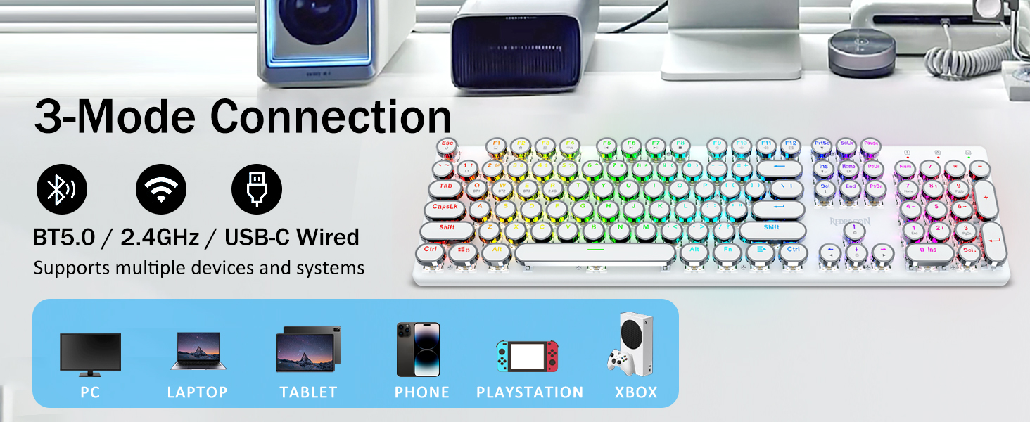𝗥𝗲𝘁𝗿𝗼 𝗧𝘆𝗽𝗲𝘄𝗿𝗶𝘁𝗲𝗿 𝗦𝘁𝘆𝗹𝗲 𝘄𝗶𝘁𝗵 𝗠𝗲𝗰𝗵𝗮𝗻𝗶𝗰𝗮𝗹 𝗞𝗲𝘆𝘀- Redragon Mechanica caeruleae virgas medias resistentias praebent, strepita sonorum & tangentium responsiones audibiles, commodas et certas ludi ambitus et effectus praebet. Vindemiatio steampunk claviaturae rotundi keycaps similis est classico scriptori, adfert te commodus typing affectum & stabilis clicking tactus.