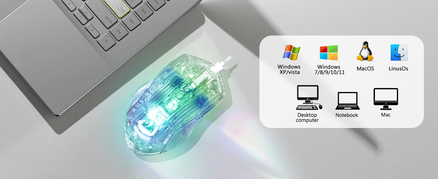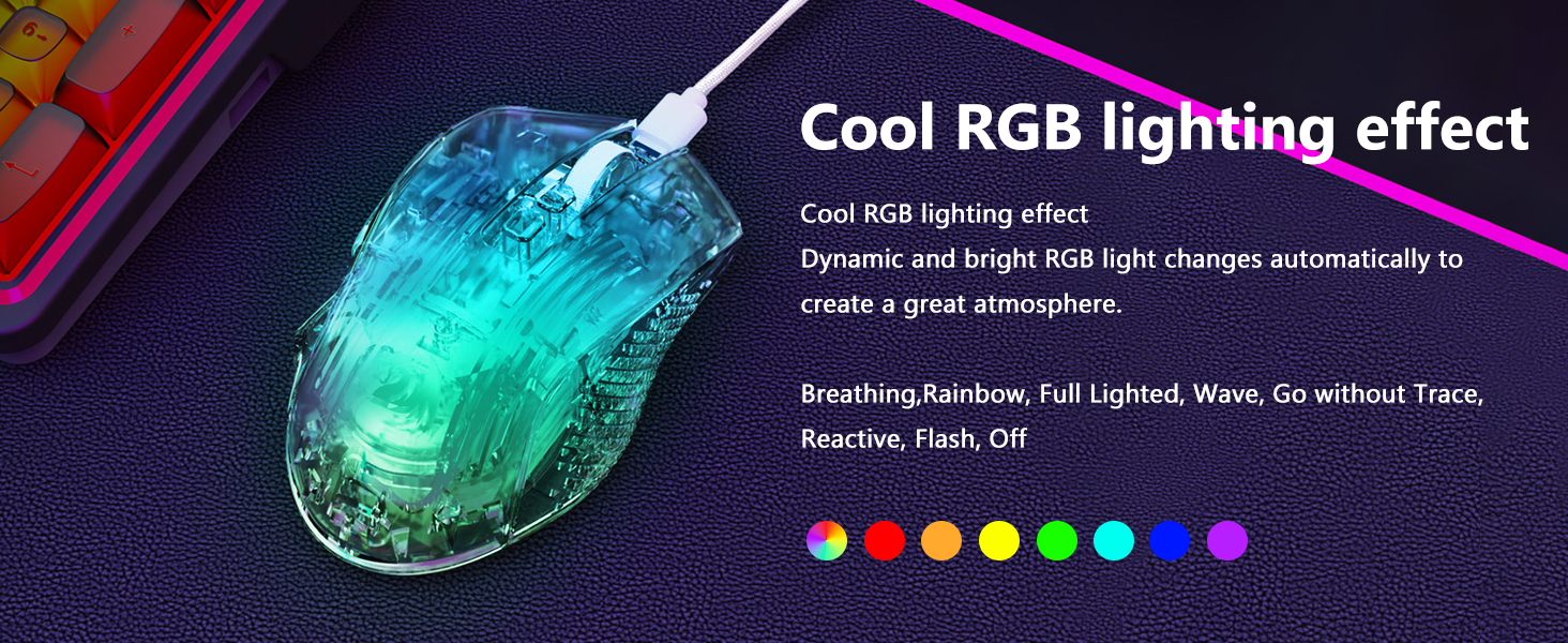 Mus octo RGB effectus illuminationis includit, qui appellationis visualium augendae sine effectu afficiuntur. Users inter modos accendi modos flectere possunt ad inserere eorum paroemiam vel personalem praeferentiam.